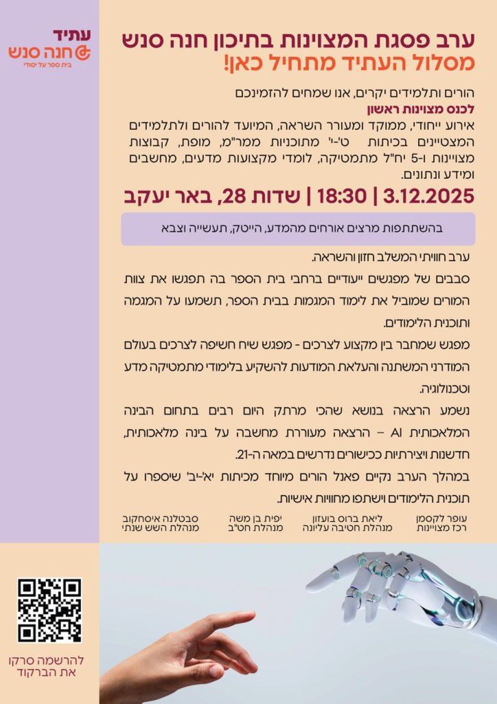 אירוע ייחודי, ממוקד ומעורר השראה, להורים ולתלמידים המצטיינים בכיתות ט'-י' מתוכניות ממר"מ, מופת, מצויינות ו-5 יח"ל מתמטיקה, מדעים, מחשבים ומידע ונתונים. נדבר על מצוינות ועל עולם המחר בצבא ובקריירה.
